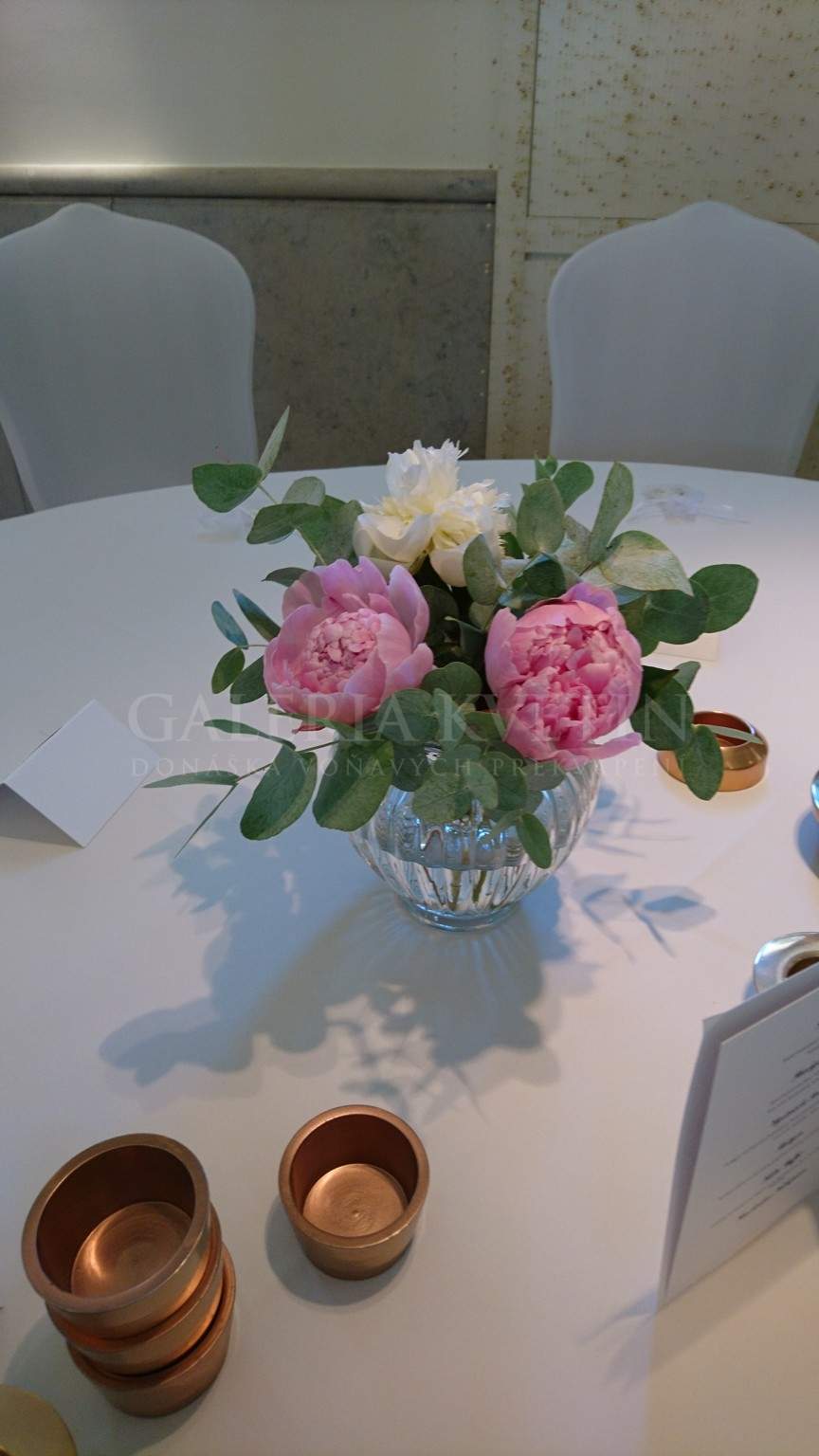 Jednoduchá a zároveň decentná dekorácia do vázy z voňavých pivoniek a nezameniteľnou vôňou eucalypthusu. Voľný štýl tejto dekorácii dodádava ten správny look na svadobnom stole. Farebné prevedenie pivoniek je možné po dohode upresniť na Vami požadovanú farbu.