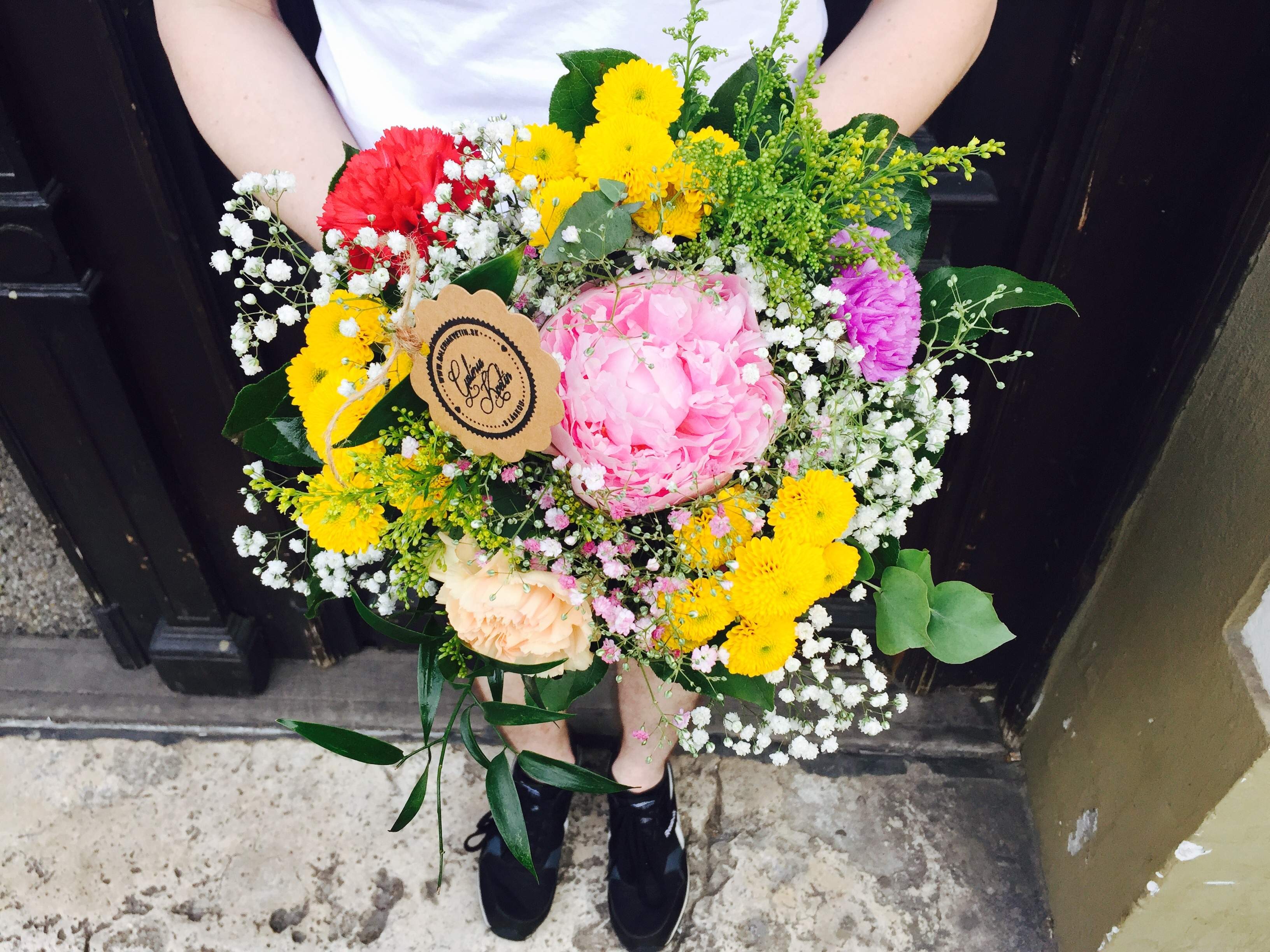 Pestrosť tejto kytice dáva vyniknúť voňavej pivonke v strede, ktorá je v spoločnosti žltých chryzantém santini, doplnená troma farbami dianthusu, zjemnená bielymi a ružovými kvetmi gypsy a doplnená zeleňou. Touto pestrou kyticou určite potešíte vaše svadobné mamy, ktoré s vami zdieľajú Váš veľký deň.