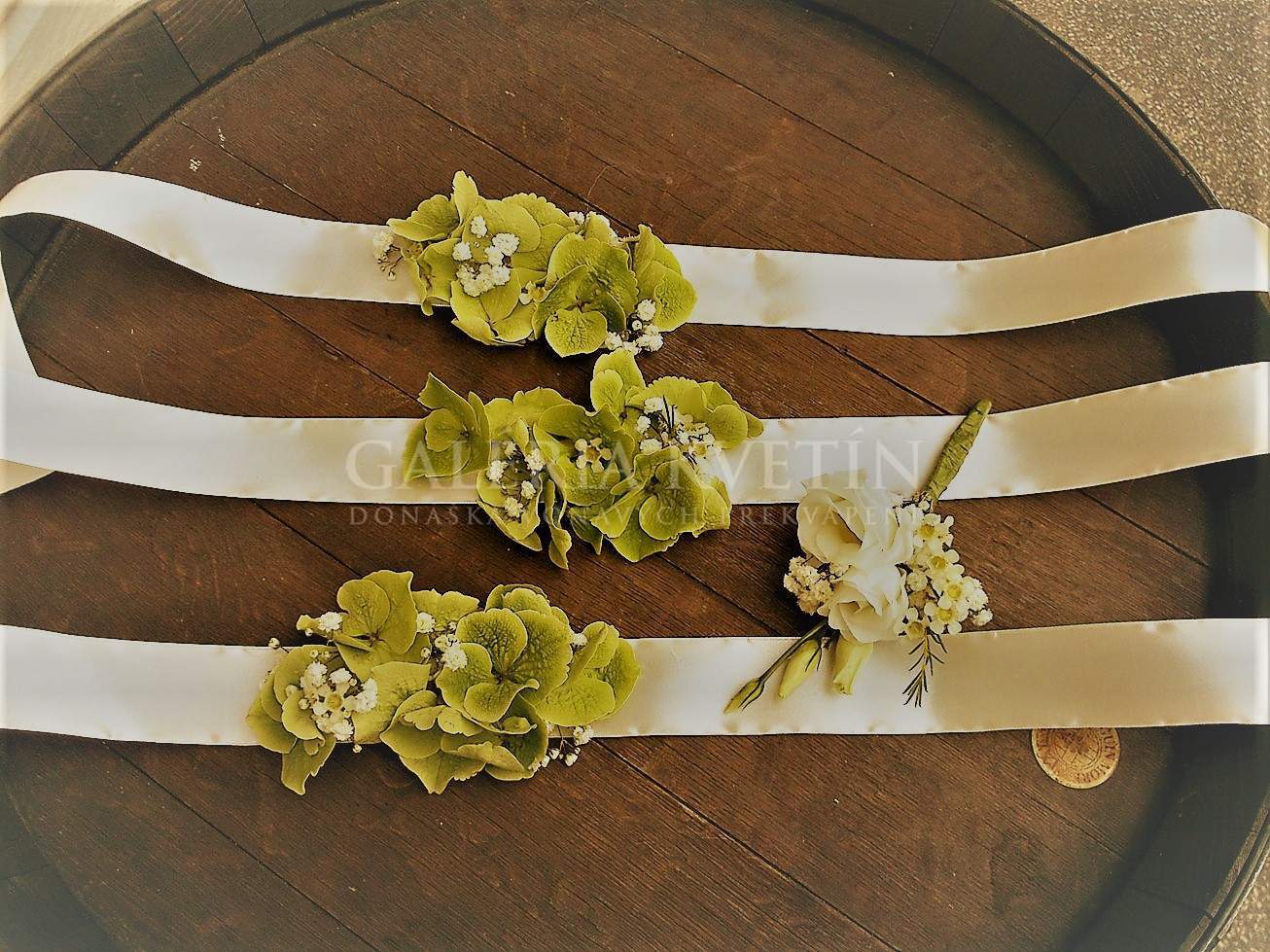 Takýto druh náramku je určený prevažne pre družičky, zelenú hortenziu si vybrala nevesta na svoju konkrétnu svadbu. Hortenziu Vám vieme podľa sezóny zohnať podľa dostupných farieb. Náramok je jemne doplnený gypsou.
