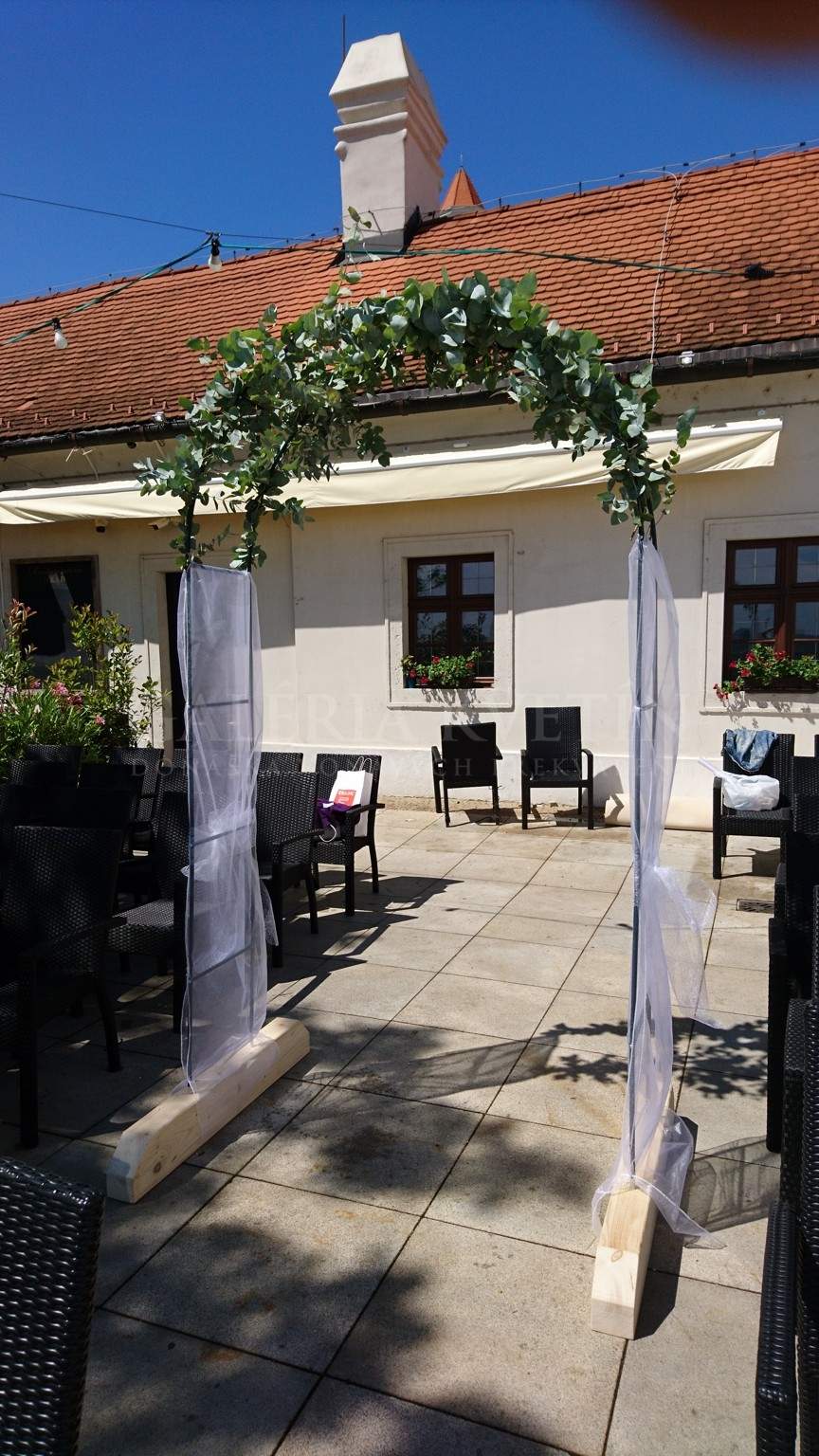 Eucalypthus má všestranné využitie - ako napríklad aj v našej slávobráne. Krásne dekoruje oblúk a boky sú zdobené bielou organzou, previazané mašľami. Veď v jednoduchosti je krása.
