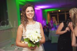 Požiadavka nevesty bola mať svadbu v bielo-zelenej kombinácii, jednoduchú a zaujímavú výzdobu. Na svadobné stoly sme jej preto pripravili vypichované gule z kvetov chryzantémy a v svadobnej kytičke mala takisto chryzantémy a biele ruže. Nevesta si priniesla krásnu striebornú brošňu v podobe pierka, ktorú sme jej zakomponovali do svadobnej kytice.