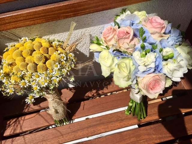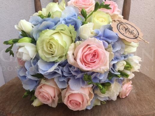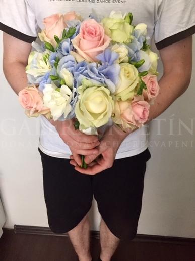 Krásna svadobná kytica z našich rúk priamo pre nevestu. Kytica je v jemných tónoch bielej, bledunkomodrej a bledoružovej, použili sme kvety ako ruže, frézie.... hortenzia. Kytica je uviazaná saténovým úväzkom v ivory farbe, ktorý je dozdobený malými hlavičkami špendlíkov v perleťovej farbe. Kytica je vznešená, nežná a romantická. Jemné farebné tóny kvetov sú ako pre Anjela :)