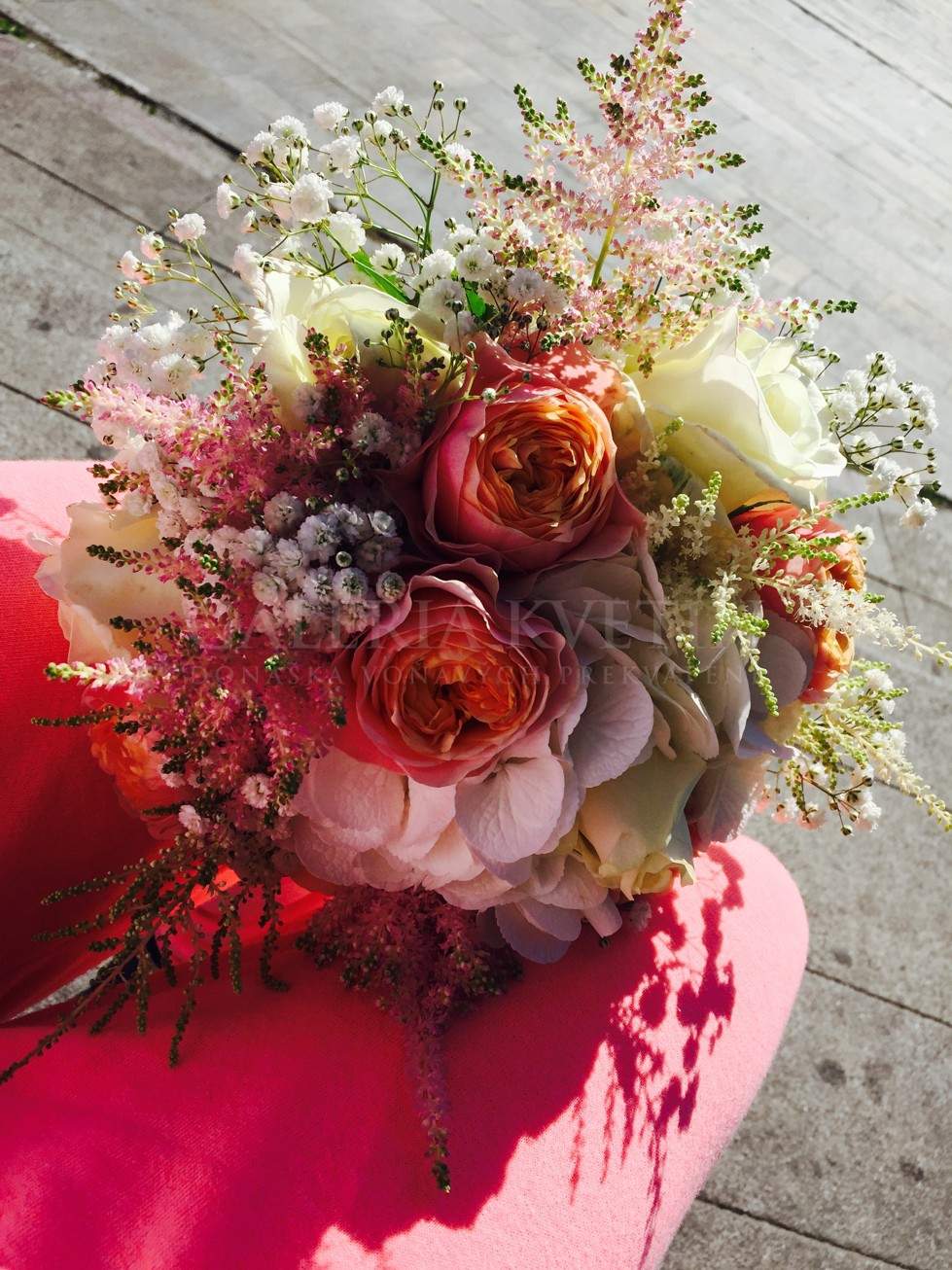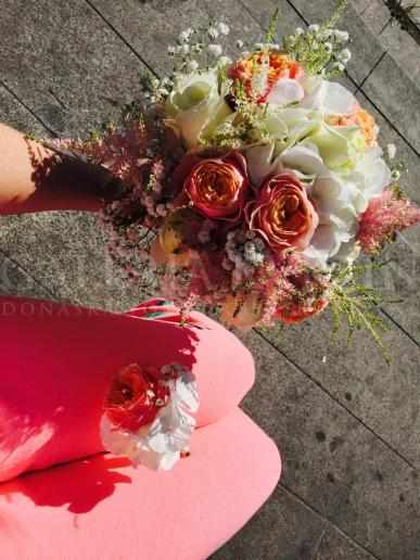 Look tejto svadobnej kytičky dotvára hortenzia a astilbe. Kytica je viazaná na guľatý štýl s tým, že použité astilbe dotvára jemne strapatý výraz. Veľmi pekná letná svadobná kytica, spolu s pierkom pre ženícha. Kytička je skôr vhodnejšia k menej zdobeným šatám. Tak ak sa Vám páči, neváhajte nás kontaktovať - farebne sa dá kytica prispôsobiť podľa Vašich požiadaviek.
