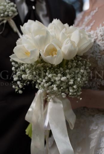 Krásna biela kytica z bielych tulipánov 30 kusov. Dotvorená je bielou gypsophilou, ktorá je jemne pomedzi aj okolo. Saténová stuha je dotvorená na uväzok z ivory odtieňu, z ktorej sú spustené mašle ivory a biela. Kytica je krásna, nežná a hodí sa tak ako k zdobeným šatám, tak aj k jednoduchým. Táto bola robená pre známu slovenskú blogerku Lapkinn na jej svadobný deň aj s pierkom pre ženícha.