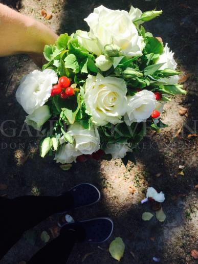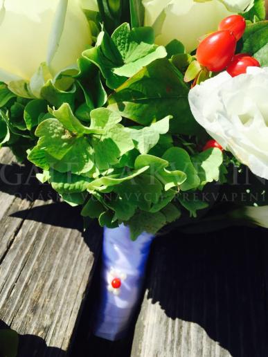 Svadobná kytica s lesným nádychom v klasickej bielo-zelenej kombinácii, doplnená jemne o červenú. V kytici vyniká smaragdovo-zelená hortenzia, ktorú v kontraste dopĺňajú biele ruže, biely lisianthus, doplnené jemne o bobuľky hyperica. Spolu s kyticou ladí aj pierko pre ženícha, aranžmán na stôl a gratulačné kytice. Kytica má svoj kukuč, ktorým nič nepokazíte :)