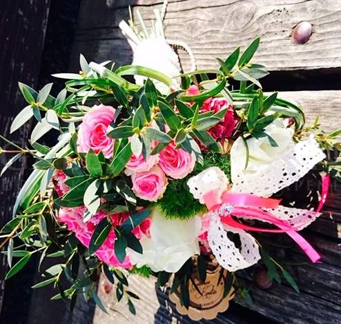Výnimočná svadobná kytica pre výnimočnú ženu. Zloženie kytice sa odvíja stredom od bielej ruže, ružových trsových ruží, dianthusu. Dozdobená je lístkami eucalypthusu, zatočenou trávou a rukoväť zdobí saténová stuha s gorálkami a veľkou ozdobou kytice je samotná mašlička z francúzskej čipky, saténu a kryštálovej kvetinky.