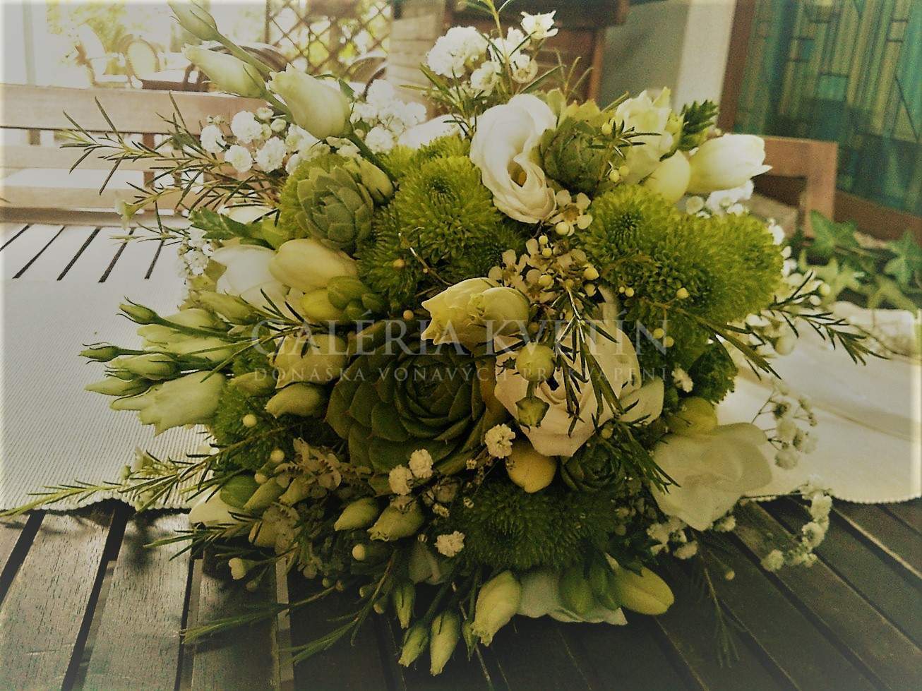 Svadobná kytica v nezameniteľnej kombinácii bielej a zelenej, ktorá vytvára nádhernú kompozíciu jednotlivých druhov kvetov. Táto kytica v sebe ukrýva rôzne tvary a štruktúty kvetov, ktoré dotvárajú strapatý výraz kytice. V strede kytice dominuje skalná ruža, obklopená feeling greenom, voňavými fréziami, jemnými kvetmi gypsy, waxfloweru, doplnená o biele kvety lisianthusu. Aby sme nazabudli :) farba Greenery je farbou roka 2017.