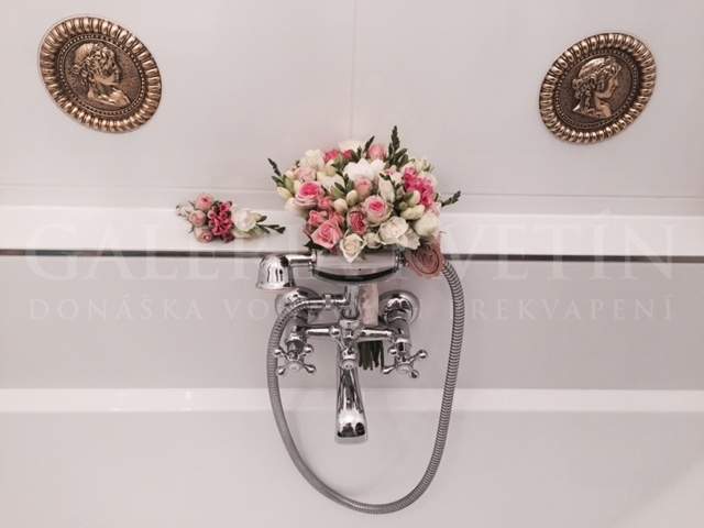 Táto kytička je kompatná, celistvá, z drobných kvietkov bielo-ružovej faby, proste taká kvetinková bacuľka. Štruktúry a tvary použitých kvetov sa krásne, hravo dopĺňajú a pôsobia cukríkovo-romantickým dojmom. Táto svadobná kytička sa Vám bude hodiť ako k jednoduchým šatám, kde krásne vynikne, tak aj k zdobeným šatám, na ktorých keď budete mať použitú čipku, tak táto svadobná kytica s ňou bude pekne hrať. Kytička je bez akejkoľvek zelene, použité sú len čisto kvety plus saténový/čipkovaný úväzok už podľa vašej predstavy a to buď v ružovej alebo bielej farbe, prípadne kombináciou oboch.