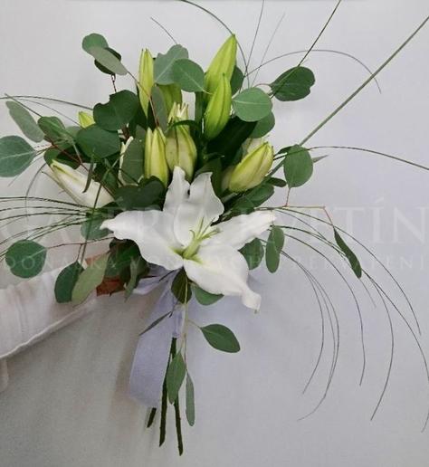 Romantická svadobná kytica, ktorá pôsobí veľmi elegantne a nežne. Dominantný kvet je ľalia, dozdobená eukalyptusom a dekoračnou trávou, zakončená saténovým uväzkom a mašľou. Farbu ľalie si môžete po konzultácii s nami určiť sami. Kytica sa hodí pre ženy s romantickou dušou a voľným štýlom k užším svadobným šatám.