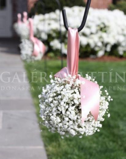 Visiaca romantická guľa na zavesenie, vytvorená z kvietkov gypsophily, previazaná saténovou stuhou. Pôsobí ako pekná a jemná dekorácia.